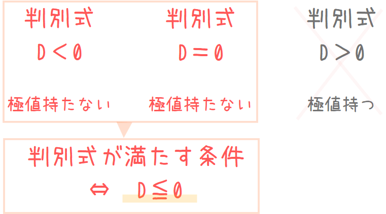 ・極値を持たない条件は、\(\small \color{#ff0055}{D≦0}\)
