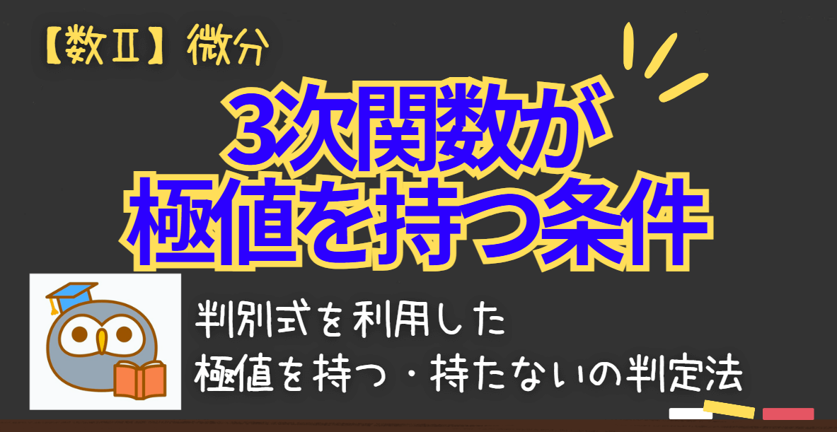 3次関数が極値を持つ条件と極値を持たない条件を求める問題の解き方について解説します。3次関数の場合は、極値を持つか持たないかの見極めは判別式を使って求めることができますが、なぜ判別式が使えるのか?どういう場合に判別式を使って解くのかについて確認してきましょう。
