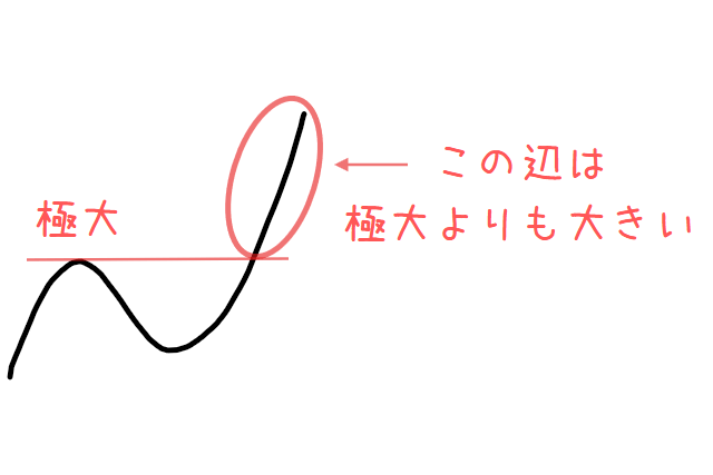 最大(最小)は、関数で「最も」大きい(小さい)場所のことですが、極大(極小)は最大っぽいところ(最小っぽいところ)という違いがあります。例えば、極大よりも大きな値をとる部分はいくらでもあります。