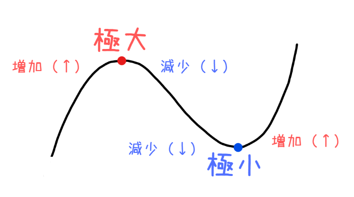 極値は関数の山と谷なので、極値の前後では関数の上り・下がりが逆転することになります。例えば、極大となる点であれば『上り(↑)から下り(↓)』に変わりますし、極小となる点であれば『下り(↓)から上り(↑)』に変わります。逆に極値以外の点では、関数の上り・下がりに変化はありません。