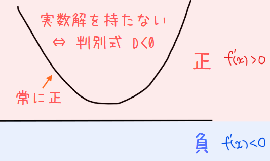 \(\small x\)軸と交わらない場合は、常に正または負になるので符号は変わりません。つまり、関数は極値を持ちません。\(\small x\)軸と交わらない=実数解を持たないので、判別式は\(\small D<0\)となります。