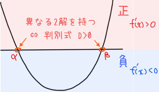 \(\small x\)軸と2点で交わる場合は、交わる前後で必ず符号が変わります。つまり関数は極値を持つことになります。2点で交わる=異なる2つの実数解を持つことと等しいので、判別式は\(\small D>0\)となります。