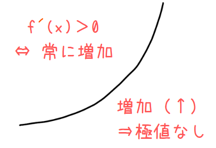 このときの関数 \(\small f(x)\)は増減が常に正になるので常に増加する関数となります。