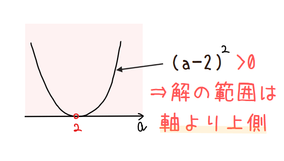 今回は不等式の範囲が『\(\small >0\)』のように正なので軸より上側の範囲が解になりますが、\(\small a=2\)のときだけ軸上となり解の範囲外になるので\(\small a=2\)以外が解となります。
