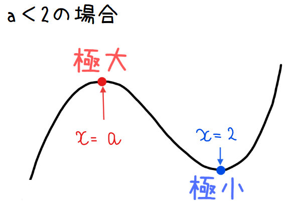 (1)の結果で極値を持つとき、\(\small a\)は\(\small a \neq 2\)を満たすので、\(\small a\)は2以外の値となり極値が1点になることはありません。ただ、\(\small a\)と\(\small 2\)の大小関係までは分からないので、\(\small a<2\) または\(\small 2<a\)の2パターンで場合分けして考える必要があります。