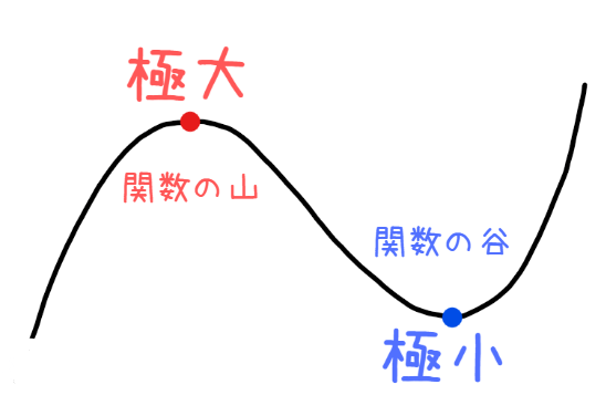 極値とは関数の山と谷のことです。山の部分を極大、谷の部分を極小と言います。