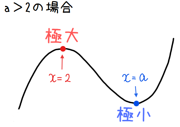 よって、\(\small x=a\)と\(\small x=2\)の2点で極値をとることが分かりました。