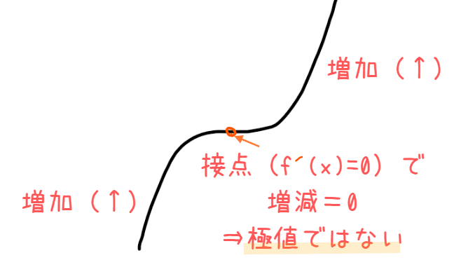 関数 \(\small f(x)\)は接点で一度増減が0になりますが、\(\small f^\prime (x)>0\)となる場合、接点前後での \(\small f^\prime(x)\)の符号は正なので、下図のような増加関数になります。