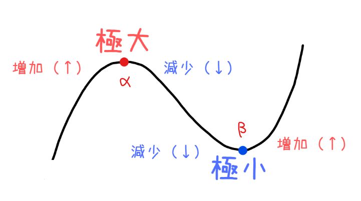 このときの関数 \(\small f(x)\)は \(\small x=\alpha\)で増減が『正→負』になるので極大となり、\(\small x=\beta\)で増減が『負→正』になるので極小となります。