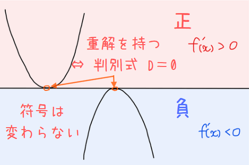 2次関数 \(\small f^\prime (x)\)の符号は、2次関数と\(\small x\)軸との交点を考えれば判断できます(このあと詳しく解説します)。2次関数と\(\small x\)軸との交点の個数は2次関数の解の個数ですから、判別式の符号に着目して確認していきましょう。