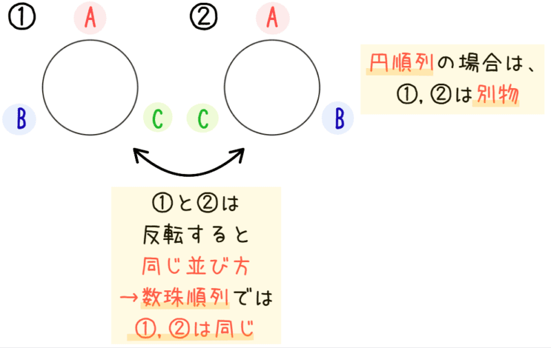 数珠順列は、円順列と比べて、反転したときに同じ並び方を1通りとみなすという点が大きな違いです。
