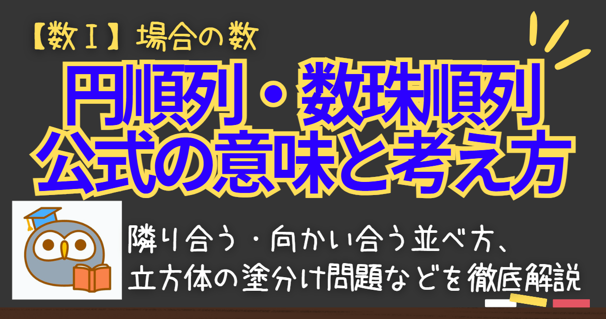 本記事では、円順列の基本的な考え方から公式の意味、成り立ちを丁寧に解説します。さらに、隣り合う・向かい合う(対面)並び方を求める典型問題の解き方や、数珠(じゅず)順列の見分け方まで具体例を使って整理しています。順列が苦手な高校生でも、仕組みからしっかり理解できる内容になっているので、一緒に確認していきましょう!