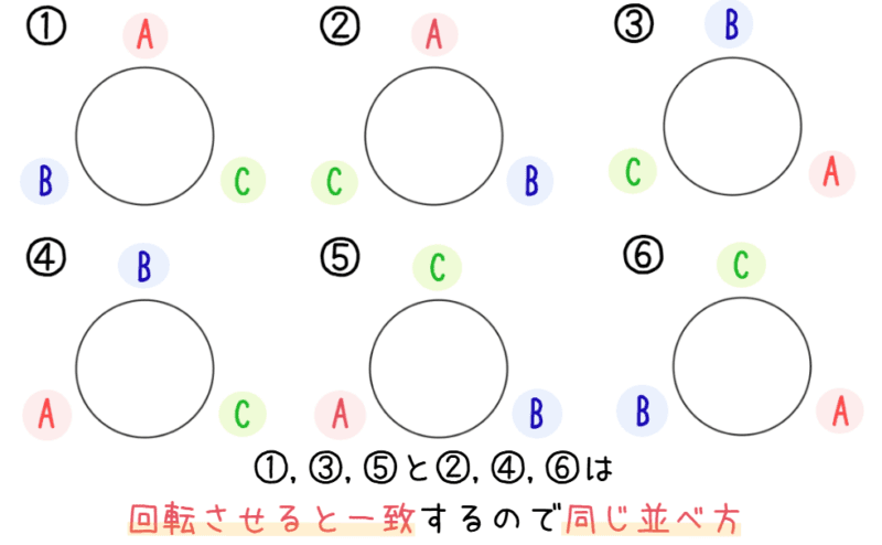 実は円形に並べる場合、回転することで同じ並び方になることがあります。どういうことか具体例で確認してみましょう。