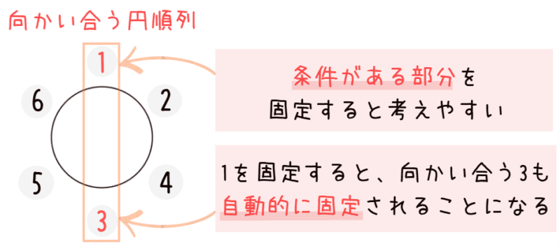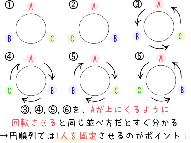 すると上記のように、①,③,⑤、②,④,⑥が完全に同じ並べ方だということが一瞬で分かります。このように、1人を固定しておけば回転を防げるので円のような回転対称の形に並べる場合に便利です。