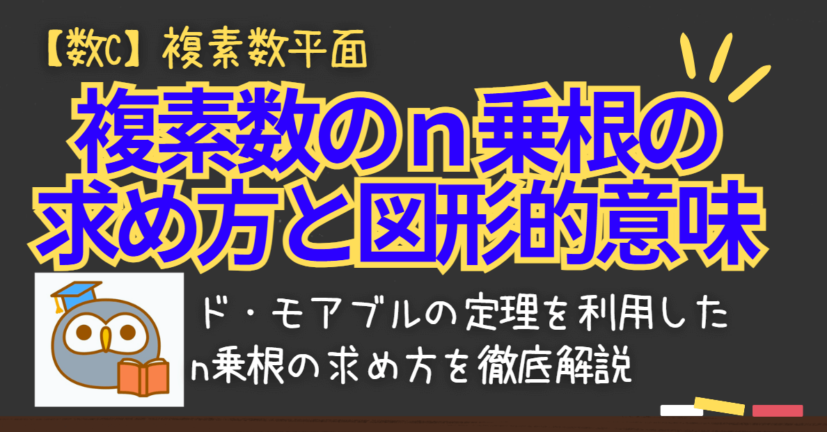 今回はド・モアブルの定理を利用する典型問題の一種である複素数のn乗根を求める問題について徹底解説していきます。また、大学入試などでもよく題材として取り上げられる\(\small n\)乗根の解が複素数平面上で持つ図形的な意味合いについても解説していきます。一つ一つ順番に理解していけば誰でも理解できる内容だと思うので、一緒に確認していきましょう!