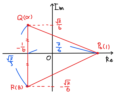 (3)複素数平面上において、\(\small 1,z,z^2,z^3,z^4,z^5,z^6\)が表す点を、それぞれ、\(\small \mathrm{P_0},\)\(\small \mathrm{P_1},\)\(\small \mathrm{P_2},\)\(\small \mathrm{P_3},\)\(\small \mathrm{P_4},\)\(\small \mathrm{P_5},\)\(\small \mathrm{P_6},\)とする。\(\small △\mathrm{P_1P_2P_4}\)の重心を\(\small \mathrm{Q}(\alpha)\)、\(\small △\mathrm{P_3P_5P_6}\)の重心を\(\small \mathrm{R}(\beta)\)とするとき、複素数 \(\small \alpha ,\beta\)を求めよ。