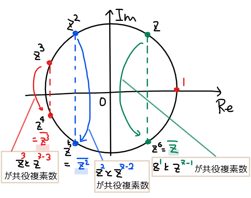 このことは、1の\(\small n\)乗根が複素数平面上で、1を出発点として円周上に等間隔に並ぶことを覚えておけば、実軸に対して線対称な位置関係にある\(\small z^m\)と\(\small z^{n-m}\)が共役複素数であると気づくことができる。